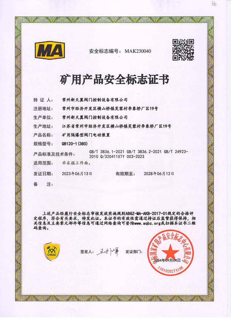 礦用產品安全標志證書QB20-1(380)